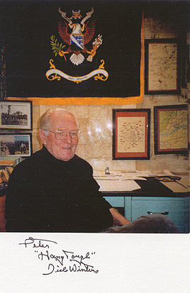 Winters is omgeven door kaarten, foto's en en souverniers die dienen als een permanante herinnering aan zijn dienst voor het vaderland als commandant van E “Easy” Company, 506th Parachute Infantry Regiment, 101st Airborne Division. Een display, gevuld met onderscheidingen, hangt aan de muur achter de deur van zijn kantoor, met daarbij een kaart van Utah Beach (Normandië) die teruggaat tot de Romeinse tijd. Verder ook Winters’ handtekening “Hang tough, pardner” cowboy poster. Op de muur er tegenover de vlag van de compagnie met links daarvan, ingelijste en gesigneerde foto's |