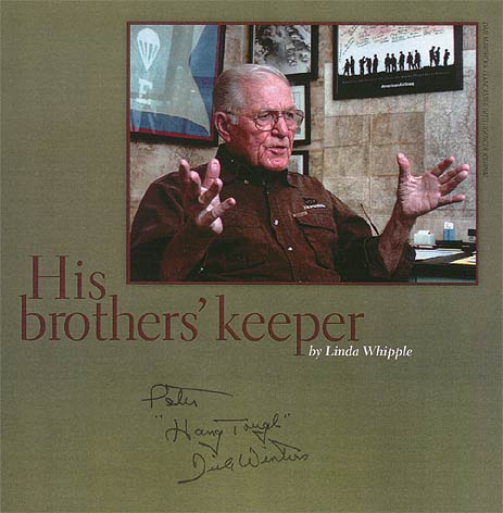 van militaire kopstukken, inclusief die van de minister van buitenlandse zaken Colin Powell. Ook hangen er foto's van Winters als soldaat en van Damian Lewis, die zijn rol speelde in de met Emmy Awards gewaardeerde miniserie van HBO: Band of Brothers, gebaseerd op het boek van Stephen E. Ambrose. “Hij begon met de zachte kant,” zegt de als gewoonlijk laconieke Winters over zijn evenknie uit de miniserie. “Ik was ook niet zo 'hot' toen ik begon.” Boven het bureau van Winters hangt de plattegrond van Bastogne die hij steeds bij zich heeft gedragen toen Easy Company tijdens de Slag om de Ardennen een 10 kilometer groot gebied rondom de Belgische stad verdedigde. Ok hangt er een ingelijste Band of Brothers poster die is gesigneerd door alle nog in leven zijnde veteranen van Easy Company—zijn “familie.” Miljoenen tv-kijkers van over de hele wereld bekeken het verhaal van de compagnie - van de training in Camp Toccoa, Ga., via D-Day en de Slag om de Ardennen - naar de verovering van Hitler's adelaarsnest. Nu hebben zelfs nog meer mensen de mogelijkheid de serie te bekijken op video en dvd. Winters is overspoeld met fan mail van mensen van allerlei leeftijden die hem zien als het voorbeeld van een held. Hij is er trots op wat hij teweeg heeft gebracht maar heeft nooit de intentie gehad om een beroemdheid te worden. Vanaf het begin was zijn doel het verhaal van Easy te vertellen. |