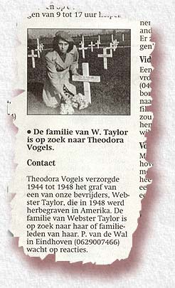 After the war it was common that young people adopted a grave site of an allied who gave his live for their freedom. On of the girls who did that was Theodora Vogels (called "Dora") (above right). Right the newspaper advertising that brought the families of Lester Taylor and |