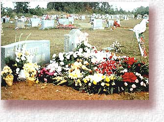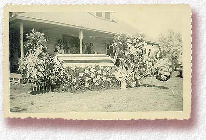 brother, Lester's funeral and burial in 1948 in the cemetery near our home in Tennessee. We lived in a small country home, (we did not have electricity then, not until 1949!).Many people came to his memorial service and burial.In one picture, the soldier is presenting the American Flag to my mother. In the background to the right is Lester's wife. She had remarried by this time so the flag went to my Mother. Sitting on the left is my Father, my Grandmother, Me (age 9), My Mom, My brother Carl, in the sunglasses. He was in the Navy during the war and at the time the picture was taken was a corporate pilot. He died when his plane crashed in April 1981. Why did we have the casket on the lawn at our home? I don't know! Maybe just to take a picture.....Some of my family and I are standing in the background and I'm holding a picture of Lester. The cemetery pictures include one of me standing behind the tombstone with some of my nieces and nephews. Another is of the grave site when my mother was buried there in 1983. Dad was buried there in 1961. We have Lester's picture on his tombstone." |