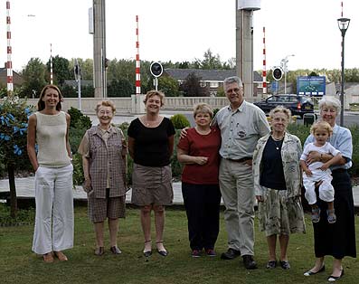 Left: in front of the bridge over the Wilhelmina Canal at Son. fltr: Mirjam (Mien's daughter)-Lies van Berkel-Ans vd Wal-Betty Taylor-Peter vd Wal-Harriët van Berkel-Mien Lavrijssen with her grandchild Eva. This bridge was important for the allies because they had to cross it on their way to Arnhem.(Hell's Highway). A few seconds before Easy Company had reached the bridge it was blown by the Germans. Carwood Lipton said about it that he could feel the pieces of wood from the bridge fly around his head.He thought be himself: "What a way to die in combat by a peace of wood." Fortunately it did not happen and they made a temporary crossing with doors from a nearby stable. |