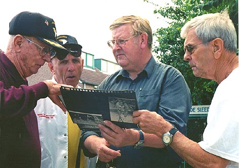 | fltr: Robert Bowen - Carmen Gisi - Bernard Florissen - Bob Lott.With the help of ordnance-maps and photos Bernard gives them the answers to their questions they had after so many years. | |||||||||||||||||