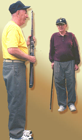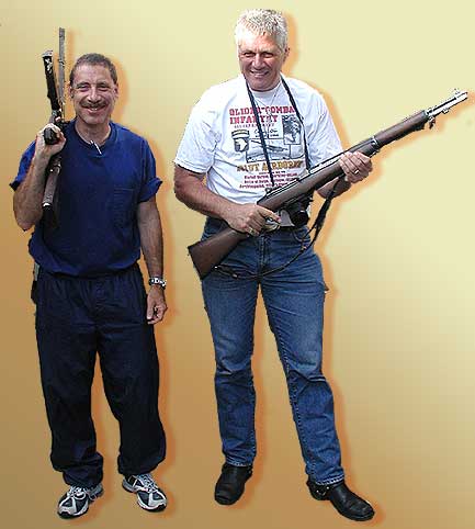 2002. Carmen Gisi (l) and Robert Bowen Robert gave the orders and Carmen tried, like 58 years ago, to carry out the instructions. He told me that 58 years ago he didn't realize that this Garrant riffle was that heavy. Now he couldn't imagine that he carried it day and night and had to walk with it countless miles. As you can see they still can do it. Though he is 88 years old, Robert automaticly stands at attention while he gives his orders. Carmen's son Charlie, who is an airline company captain, wanted to have a photo while carrying a German automatic wapon from wwII. Above right with the webmaster.(r) |