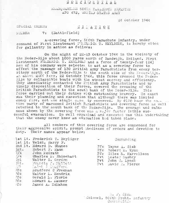 Deze eervolle vermelding werd door Col. Sink gegeven aan 20 mannen van Easy als waardering voor hun heldhaftig optreden aan de Nederrijn in de nacht van 22 op 23 oktober 1944. Onder leiding van Fred Heijliger werden door hen 130 Britse Red Devils de rivier overgezet en zodoende uit handen van de Duitsers gered. Ik kreeg deze brief van Lester Hashey die ook aan de actie deelnam. Gebruik de browserpijl om terug te gaan naar de vorige pagina. |