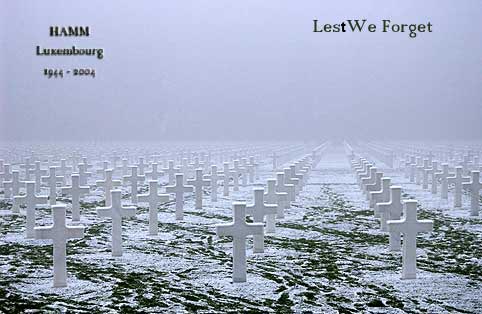 On December 16, 2004 in the afternoon there was a commemoration at the US War Cemetery at HAMM Luxembourg. The veterans were welcomed at a snowy and foggy cemetery Also present were the Grand-Duc and Grand-Duchesse from Luxembourg and J. Dennis Hastert 'speaker of the house'. The commemoration was held in a releaxed atmosphere. The Royal Family from Luxembourg had unconstrained conversations with some of the veterans while walking between the many white crosses. |