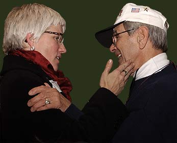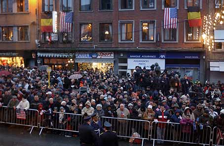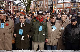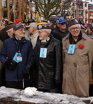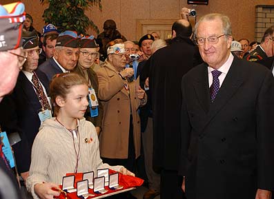 Saturday afternoon, December 18, 2004, his Royal Highness King Albert II of Belgium came to Bastogne to hand commemorations coins to 6 already selected veterans. Prior to that he threw nuts from the city hall balcony to the gathered people in front of the Bastogne town hall. This is a tradition because Bastogne is also known as "Nuts Town" because of Gen. Mc Auliffe's legendary answer to the German commander when he asked the Allies to surrender. |