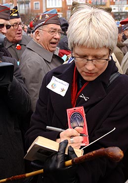 .Among the invitees also was present the Grand Daughter of General George S.Patton, Helen. Above: signing my book 'Currahee', while carrying her Grandfather's cane. |