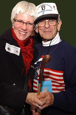 In Bastogne 6 members from Band of Brothers were present. Above left: Ear McLung -webmaster- Buck Compton-Shifty Powers. Above middle: Don and Irene Malarkey and Bill Guarnere. Above right: Bill and Babe. Is was a pity that they left before the commemorations started. The were the guests of the US Army and had visited an Army unit in Hagenau Germany. |