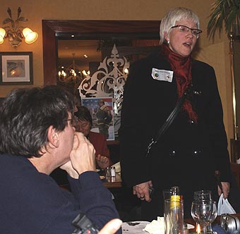 Later on that day we met her again in a restaurant where she gave Bob a warm welcome. To Bob a memorable moment that he will not forget for the rest of his life. Above: A tender tête a tête between Helen Patton and Bob Lott. Right: Helen surprised us when she started to sing "White Cliffs of Dover" at our table. Bob's son Rob listens attentive. |