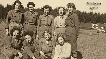 As told by Kate Nolan, 53rd Field Hospital. "I was in from Aug. 6, 1943 until March 1946. We had to be registered nurses. When they'd get enough people, they'd put us through basic training. We trained at Fort Bragg and went to England where we had intensive physical training, 10-miles hikes, three times a week, with full packs. Up hill and down dale and rains and everything. We needed stamina because of the long hours en de living conditions. We were in tents pretty much all the time. Shortly after D-Day we landed at Utah Beach and after St.Lo we were with the 3rd Army. We went from Brittany to the Ardennes, the Battle of the Bulge, and Central Europe and to the Rhineland. We did not have helicopters so the field hospitals had to be within 5 miles from the front. Usually we were closer. |