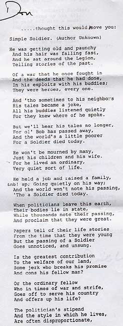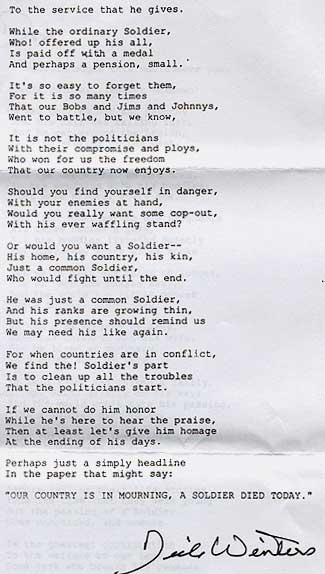 Like so many others, he had chosen for the Airborne because of the $50,-- bonus. The most impressive part of the training was his first jump. Before the war he only had heard the characteristic things like the canals, dikes and the little boy who saved Holland from flooding by putting his thumb in a hole in one of the dikes. The announcement that the war was over made a huge impression on Don because he realized that he had survived those terrible years. Before the war he was employed at Cater Pillar Tractor Co. He returned there after the war un till he retired in 1982. He doesn't think that his children have been influenced in one or another was because he was in a war. For Don it was just a job that had to be done. This shows that Don was a humble man who thought it a normal thing to do. He also told me that he did not recall the important moments from WWII. He was one of very few who told me that it was not necessary to remember the war every year. "It happened and that's it." he says. I received a poem from Don that was send to him by Dick Winters. He said to me: "I think this poem says more than I can tell. That should do."" |