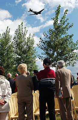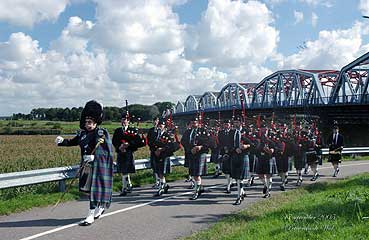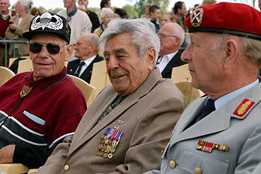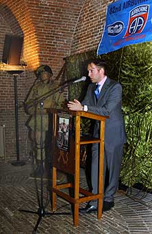 Above left: Bob de Vinney (l) Jim Megellas (middle) next to the German General Richter who was invited for this occasion. Bob de Vinney is a veteran from the 504th PIR, 82nd Airborne Division, the same regiment as Jim Megellas served with. The Batavorum Pipes and Drums from Nijmegen attended the festivities to bring the music that is so characteristic for this occasion. | |||||||||||||||||||||||||||||||||||||||||||