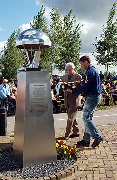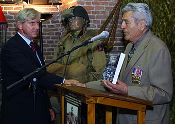 Alexander Omhof (r) (Market Garden Committee) took the initiative for the translation of the book and induced the author to publish in Dutch. It also was the first time in the history after WWII that a German Army representative was invited by the Market Garden Committee to attend the commemoration at the Grave bridge. |