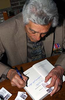 After Jim Megellas had offered the first edition of his book to the deputy Mayor of Grave (H. Willemse) he autographed the books that were bought by the guests. |