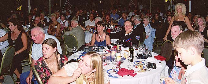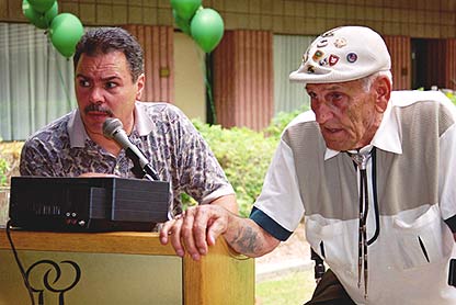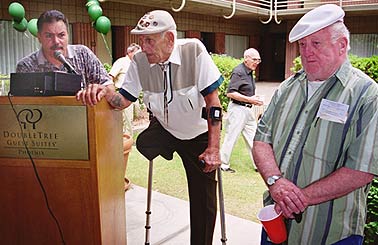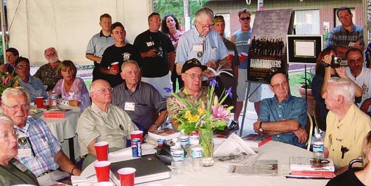 Above middle : Bill Guarnere (with next to him his son Gene) during his anouncement and request for a new organizer. Left: "Babe" Heffron (Bill's buddy since WWII) listens with mixed emotions. Veterans listening to Bill. At the table fltr:, vlnr: B.K. Masterson - Don Malarkey - Herb Suerth - Joe Lesniewski - Henri Zimmerman and Richard Wright - Paul Rogers. Standing, with the book: Norman Neitzke. |