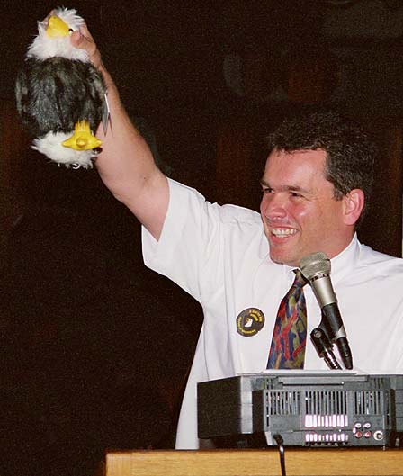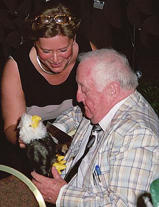 | While traveling through the U S, Steph Leenhouwers, a Dutch friend of Bill en Babe, found two Eagles, the symbol of the 101st Airborne Division. During a comic speech he announced that those Eagles from now on could be bought as a new Easy Company item. It sounded credible until he showed an Eagle with one leg, symbolizing Bill. But when he mentioned the telephone numbers to order the Eagles: The phone numbers of Bill and Babe and Merav Brooks (HBO), nobody believed him anymore. Though he managed to keep the attention of all the guests and I think nobody will ever forget this speech. | ||||||||||||||||||||||||||||||||||||||||||||||||||||||||||||||||||||||||||||||||||