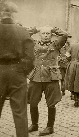 soldiers manning the gun. The photographs I sent you tell the rest of the story. I went home to find Dr. Goyarts who had just been passing by, bandaging my fathers leg because he had been hit by a piece of shrapnel from the German gun firing on the Butcher shop. |